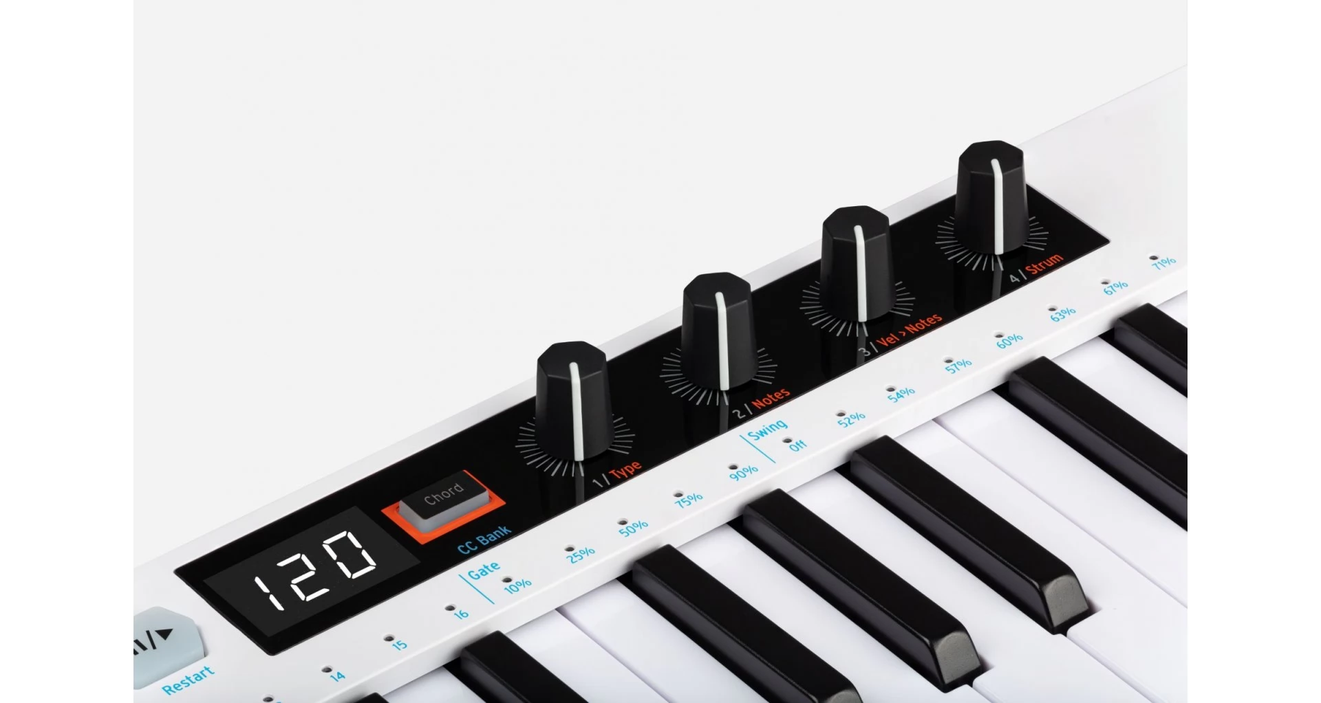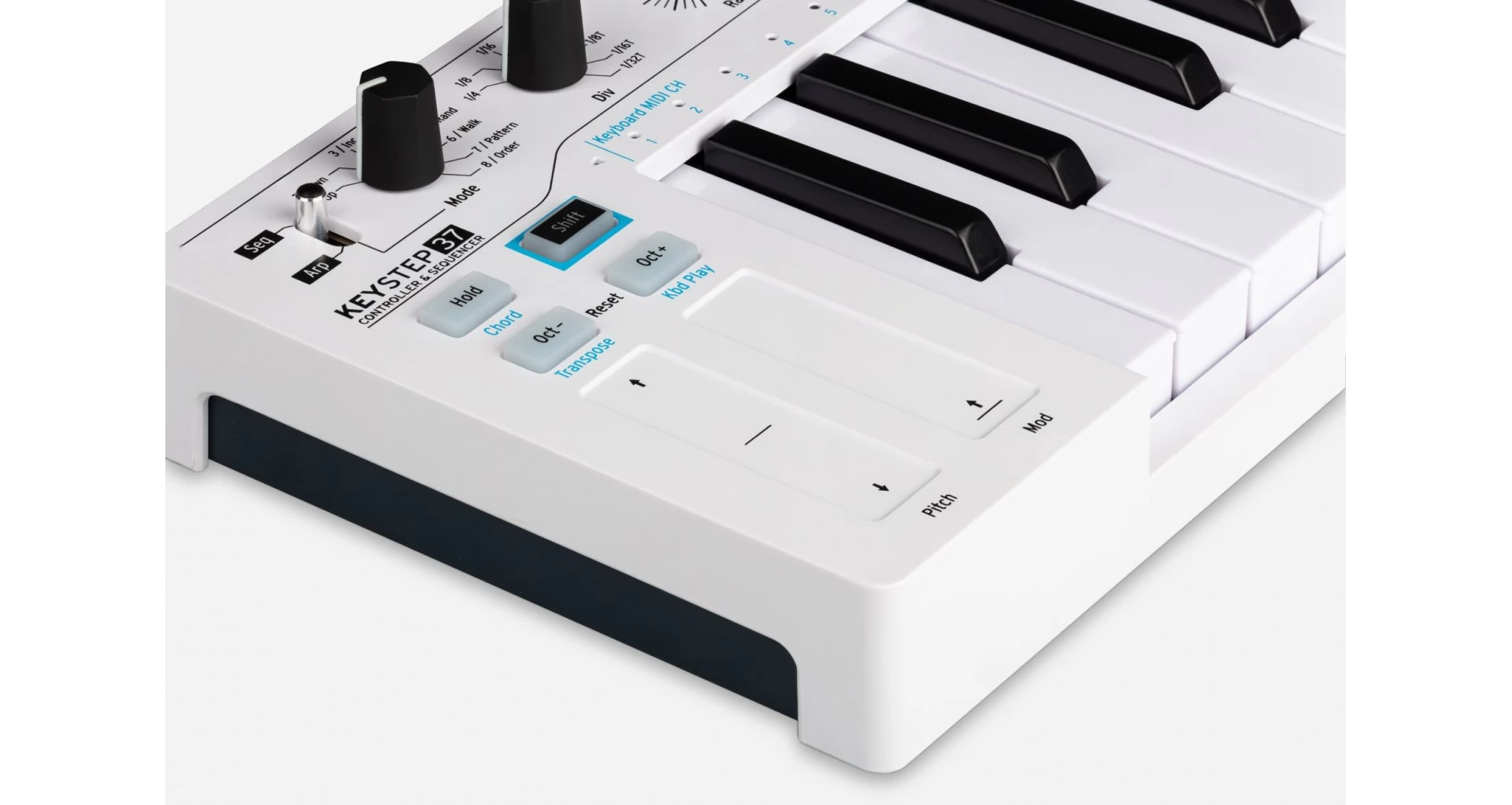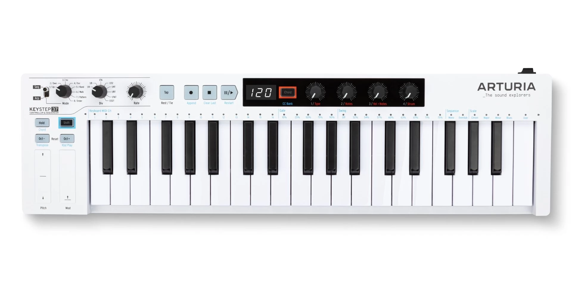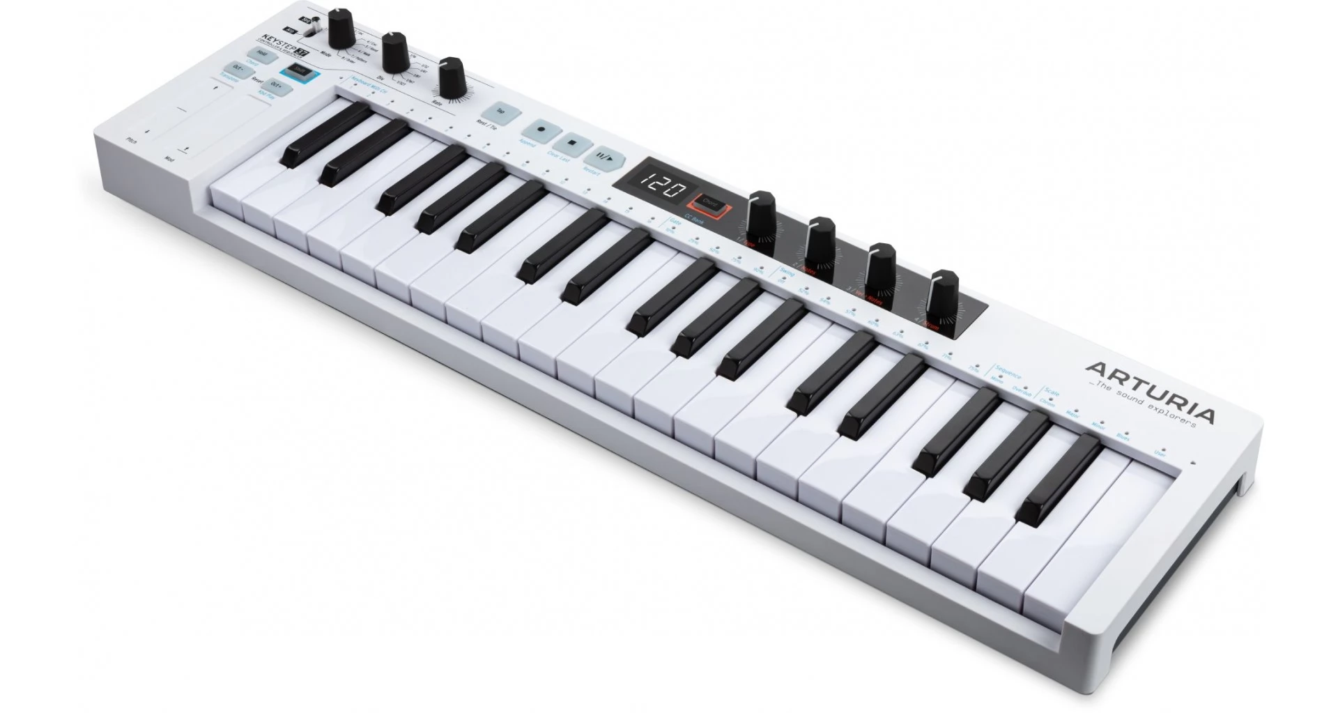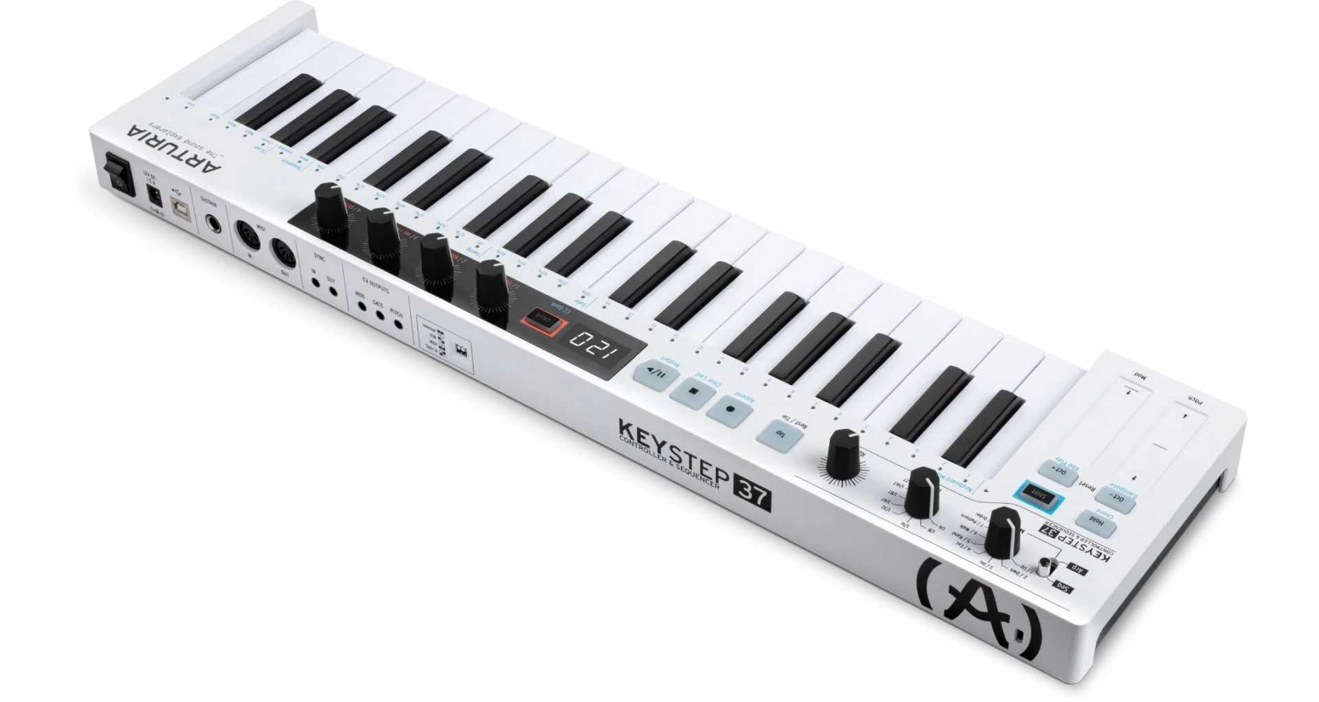 Arturia KeyStep 37 este o claviatura MIDI compacta, cu 37 de clape mini cu detectare de velocitate si aftertouch. Integreaza sequencer cu 64 de pasi, arpegiator, functii de acorduri si game, precum si 4 controlere assignabile si touch strips pentru pitch si modulatie. Conectivitatea include USB, MIDI, 3 iesiri CV, clock sync si intrare pentru pedala de sustain. Dispune de afisaj LED si banda LED RGB pentru feedback vizual. Dimensiuni 550 x 35 x 147 mm, greutate 1,6 kg. Include cablu USB, adaptor anti ground loop si licenta Ableton Live Lite.