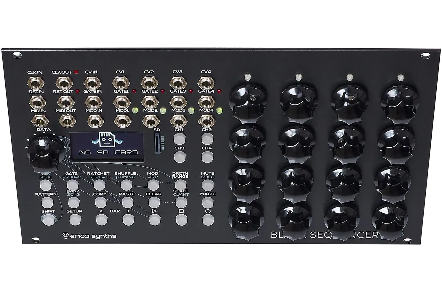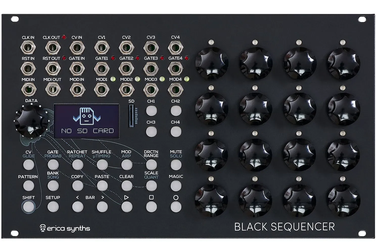 Black Sequencer este într-adevăr foarte actual. Fiecare dintre cele patru trackuri oferă ieșire CV pentru valori de note, ieșire gate, precum și o ieșire de modulație pentru secvențe mai dinamice. Intrările și ieșirile MIDI sunt disponibile sub formă de mufe jack, ceea ce elimină necesitatea a două interfețe (CV la MIDI și MIDI la CV). Pattern-urile pot avea până la 64 de pași și pot fi concatenate în mod „song”.