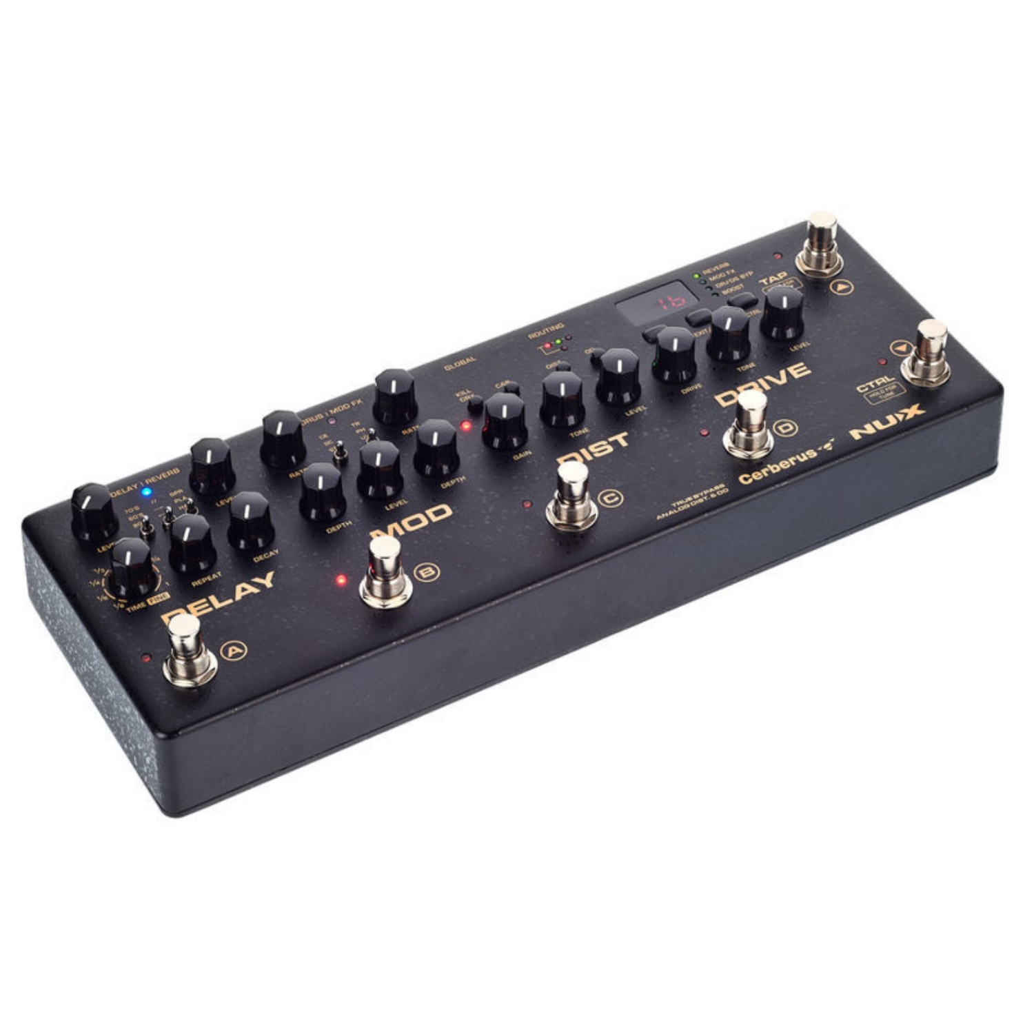 De la tremolo vintage la phaser-ul cald și apoi la vibrațiile U-vibe, efectele de modulație ale acestei pedale vă vor cuceri cu siguranță. De asemenea, veți avea la dispoziție posibilitățile divine ale a trei efecte de chorus diferite, efecte de delay inspirate de anii '60, '70 și '80 (echipate cu tap tempo) și trei efecte de reverb. Indiferent dacă doriți o ambianță frumoasă sau putere pură pentru a alimenta acele solo-uri devastatoare, NUX Cerberus permite sculptarea sunetului foarte rapid.