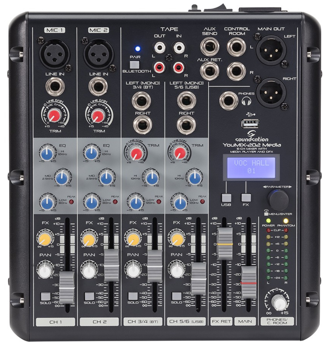 Mixer Youmix 402 Media Seria de mixere audio Soundsation YouMix combină portabilitatea cu preamplificatoare de top. Utilizarea componentelor SMD de înaltă calitate le permite să concentreze nenumărate funcții care, în mod normal, necesită mult mai mult spațiu de stocare. Această serie include două modele cu 2 și 4 canale de microfon / linie (plus 2 intrări stereo line) - YouMix-202 Media și YouMIx-402 Media, ideale pentru muzică live, înregistrări de orice fel acasă ori podcasting. Preamplificatoarele de microfon oferă un headroom ridicat și reduc zgomotul de fundal, pentru a garanta un sunet curat și natural din orice sursă. Seria YouMix vă oferă 256 de presetări de efecte digitale, care acoperă majoritatea reverb-urilor (room, hall, vocal și plate), efecte de delay, echo, chorus și flanger. Playerul USB acceptă fișiere în format MP3 (până la 48kHz - 32 biți @ 320kbps), iar receptorul Bluetooth asigură streaming audio profesional. Seria YouMix reprezintă soluția compactă, dar cu performanțe superioare pentru cei care doresc rezultate de calitate în orice situație.