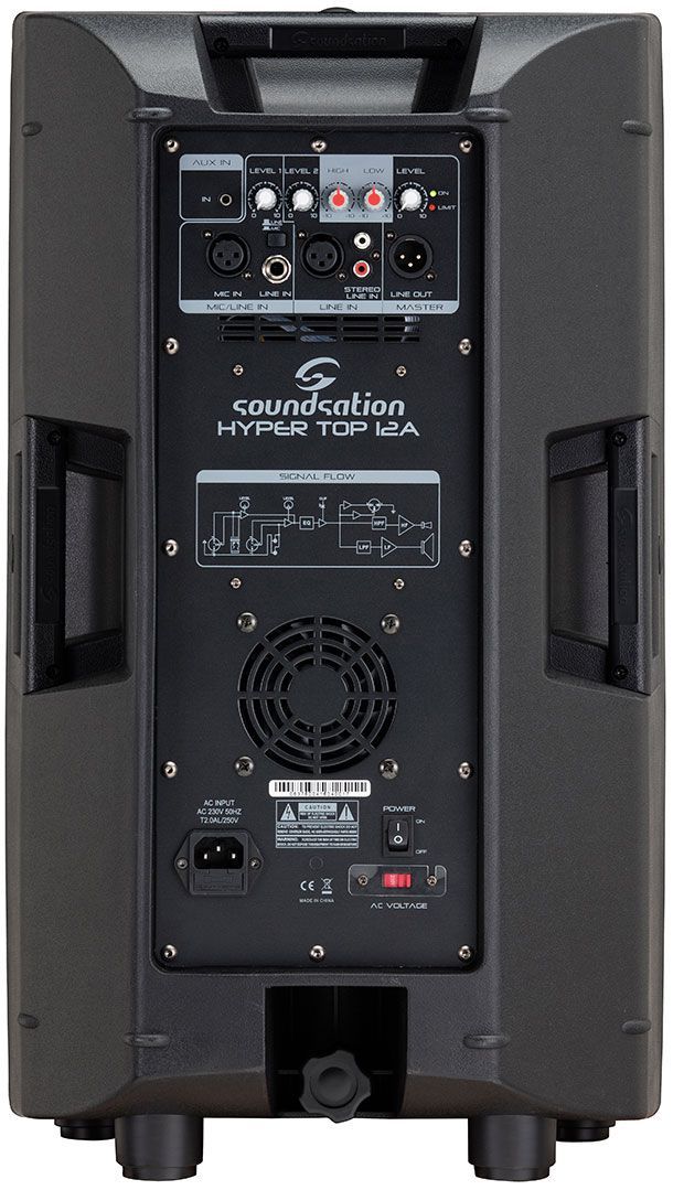 Soundsation Hyper Top 12A este o boxa activă echipată cu un tweeter și un woofer de 12", capabilă să producă o putere muzicală de până la 1000W. Această serie de boxe active oferă incinte robuste, ușoare, construite din polypropylen cu grilaj metalic și burete pentru protecția difuzoarelor. De asemenea, sunt echipate cu 3 canale de intrare, trei mânere laterale pentru manipulare, 4 picioare de fixare pe podea și o flanșă de fixare pe stativ de boxă cu diamnetru de 36mm.