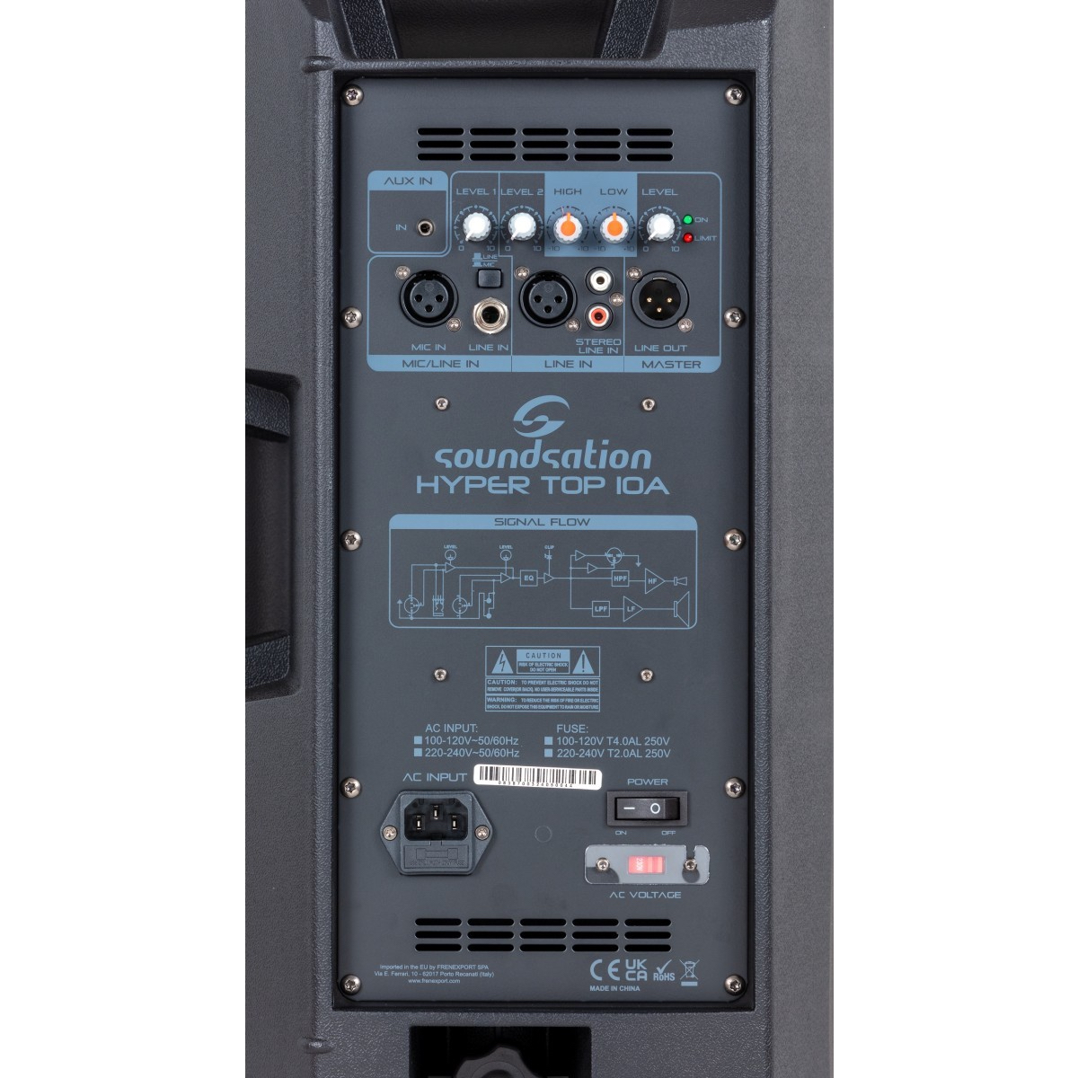 Soundsation Hyper-Top 10 reprezintă o nouă etapă importantă în evoluția celebrei serii Hyper de la Soundsation. Puterea, calitatea audio și controlul modelelor anterioare sunt acum integrate cu funcțiile care sunt esențiale pentru cei care folosesc profesional boxa ca instrument de lucru. Amplificatoarele de D-Class de 500 W, woofere și drivere de compresie selectate, DSP pentru control Crossover, EQ, limitator pe 2 benzi, aliniere de fază și optimizare a întârzierii wooferelor și driverelor de compresie. Toata aceasta tehnologie poate asigura performante ridicate si calitate audio maxima in orice conditii de utilizare. Panoul de control include două intrări XLR-Combo Mic/Line, ieșirea Mix și 4 programe audio (muzică, live, monitor, vocal) pentru a adapta rapid difuzorul la principalele utilizări. Dulapul elegant și robust este proiectat pentru a fi instalat vertical pe podea sau pe un stativ/trepied de 35 mm și, de asemenea, suspendat orizontal sau vertical datorită celor 4 puncte de fixare M8.